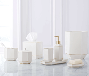 With its sophisticated hexagonal shapes and gold accented details, St. Honore bath accessories are an exquisitely luxe addition to the bathroom. Embossed fine porcelain with gold accent.