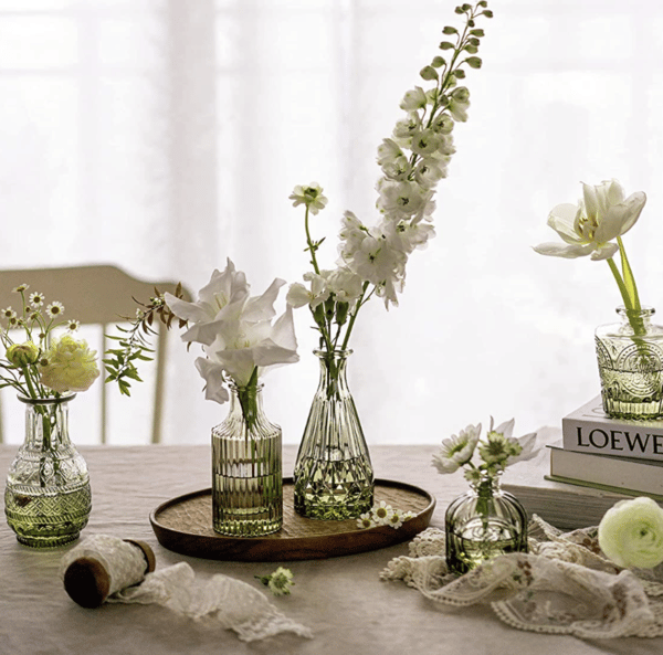 Each unique mini vase is etched in vintage patterns with a different size, and shape. These small glass vase are best suited for displaying a single stem.